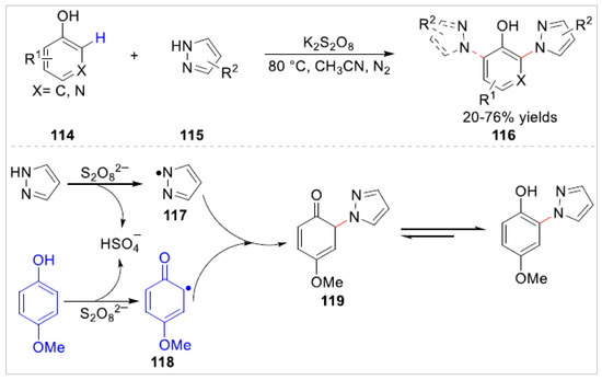 In 2020, Lei’s group [45] reported a K2S2O8 -induced azolation of electron-rich free phenol derivatives 114 with pyrazoles 115 under catalyst-free conditions. A variety of N-arylazoles 116 bearing the electrondonating groups were obtained with 20–76% yields via oxidant-induced strategy. Detailed experiment studies suggested that a radical coupling process between the N-centered radical 117 and the C-centered radical 118 might be involved in this azolation transformation, which was generated by the oxidation of K2S2O8 (Scheme 19).