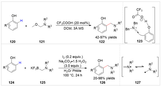 In 2021, Liu and co-workers [46] reported a Brønsted acid catalyzed chemo- and ortho-selective aminomethylation of free phenols 120 with N,O-acetals 121 under mild conditions. Various aminomethylated phenol products 122 were obtained with 42–97% yields. The high ortho-selectivity was attributed to the formation of an intermediate 123 via the interaction of CF3COOH with the free phenol (Scheme 20). Later, Zhou et al. [47] developed an aqueous C–H ortho-aminomethylation of free phenols 124 with trifluoroborates 125 by iodine catalysis, affording various functionalized phenol derivatives 126 in 20–98% yields. Based on controlled experiments, the authors proposed that the aminomethyl radical intermediate 127 was involved in the reaction pathway by oxidation of the hypoiodous acid (Scheme 20).