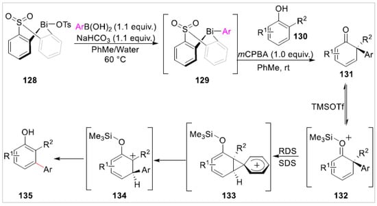 The meta functionalization of free phenols is challenging because the phenolic hydroxyl group can not only activate the aromatic ring for aromatic electrophilic substitution, but also guide its ortho or para-substitution [48,49,50]. Besides, the meta-sites of phenol are not easily activated by metal chelation [51,52]. As a result, the meta-C–H functionalization of free phenols could not be achieved via existing methods based on conventional C–H functionalization, electrophilic aromatic substitution, or oxidative coupling. Recently, Senior et al. [53] reported a meta-selective C–H arylation of polysubstituted free phenols 130 via regiodiversion of electrophilic aromatic substitution. This method achieved the meta-selective C–H arylation of sterically congested phenols through a Bi(V)-mediated electrophilic arylation and a subsequent aryl migration/rearomatization. A variety of the products of the meta-selective C–H arylation of phenols 135, including the electron-donating and electron-withdrawing groups, were obtained in excellent yields. A preliminary mechanistic study suggested that this reaction involved a phenonium ion intermediate 133 (Scheme 21).
