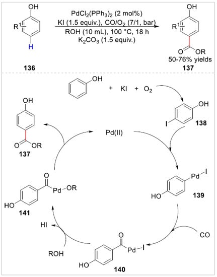 In 2018, Bhanage and co-workers [54] reported a palladium-catalyzed aerobic oxidative carbonylation of a C–H bond of free phenols 136 for the synthesis of p-hydroxybenzoates 137 in 50–76% yields using molecular oxygen as a terminal oxidant. The substrates bearing the electron-withdrawing meta-nitro, meta-trifluoromethyl groups on phenol were not compatible with this reaction system and no corresponding products were observed. Besides, p-cresol with methanol also failed to react under the optimized reaction conditions. Based on controlled experiments, the authors proposed that the carbonylation reaction involved the in-situ production of an intermediate 4-iodophenol 138 that subsequently underwent the nucleophilic attack of alcohol to offered p-hydroxybenzoate 137 via reductive elimination of palladium metal (Scheme 22).