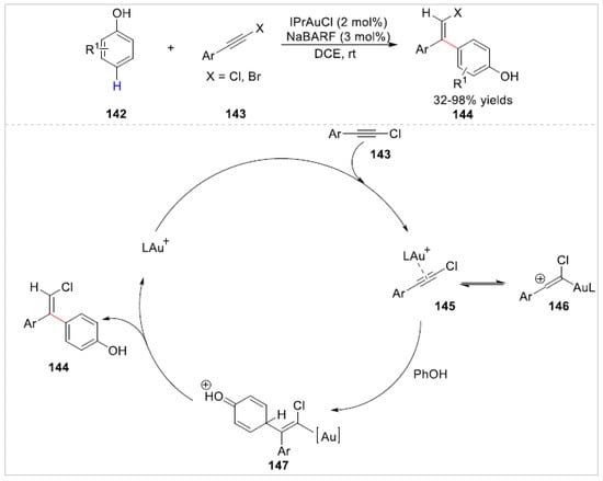 Later, a gold-catalyzed highly chemo- and regioselective C–H bond functionalization of free phenols 142 with haloalkynes 143 was developed at room temperature by Hashmi’s group [55]. A series of the products of para-C–H functionalization instead of OH-additions 144 were obtained in good to excellent regio-selectivity and diastereoselectivity, which was attributed to the catalyst and the base-free condition in this reaction. When the preferred position was blocked, the ortho-C–H functionalization of free phenols was feasible. A preliminary mechanistic study suggested that the gold catalyst directly coordinated the chloroalkyne carbon, which formed the more stable π-activated alkyne 145/vinylcation 146. Then, the C-4 position of free phenols attacked the highly electrophilic alkyne instead of O-H insertion to generate β-haloalkenes 144 (Scheme 23).