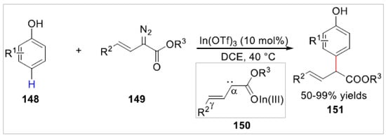 In 2021, the Liu group [56] reported a regiospecific and site-selective C–H allylation of free phenols 148 with vinyldiazo compounds 149 catalyzed by In(OTf)3. A series of phenol-allylation products instead of OH-additions 151 were obtained with 50–99% yields (Scheme 24). The reactions of aryl substituted vinyldiazoacetates with phenols provided the para-C–H allylation products, but alkyl-substituted vinyldiazoacetates transformed the ortho-selective-C–H allylation products under the standard catalytic conditions. Based on controlled experiments, the authors proposed that this allylation reaction involved a carbene intermediate 150, which was generated during the reaction process by In(OTf)3 releasing of N2.