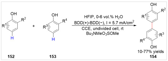 Waldvogel’s group [57] reported an efficient electrochemical synthesis by dehydrogenative coupling of free 2,6- or 2,5-substituted phenols under metal catalyst- and oxidant-free conditions in 2019. A variety of the desired 4,4′-biphenols 154 were obtained with 10–77% yields by anodic dehydrogenative cross- and homo-coupling in an undivided beaker-type cell equipped with two boron-doped diamond (BDD) electrodes at a constant current of 5.7 mA/cm2, using Bu3NMeO3SOMe as the electrolyte in 1,1,1,3,3,3-hexafluoropropan-2-ol with 0–6 vol.% water (Scheme 25). A preliminary mechanistic study suggested that this reaction involved a radical intermediate produced by the anodizing of the phenol at the anode, which was subsequently trapped by the phenolic component.