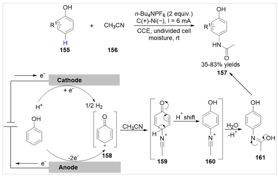 In 2022, Banerjee and co-workers [58] developed an efficient electrochemical approach to the Ritter-type reaction at the C(sp2)–H of free phenols 155 in the presence of acetonitrile 156 for the direct synthesis of paracetamol 157 under exogenous oxidant- and catalyst-free conditions. The amination reaction was conducted in an undivided cell equipped with a graphite anode and a nickel cathode at a constant current of 6.0 mA, using n-Bu4NPF6 as the electrolyte at room temperature (Scheme 26). The substrate range of this reaction was mainly free phenol derivatives, and the naphthols (α and β) and benzyl cyanide were not compatible with these reaction conditions. Based on the results of this reaction, the electrochemical C–H amination reaction was proposed to initiate via anodic oxidation of the phenol to generate carbocation 158, which underwent classical Ritter steps in the presence of acetonitrile 156 to deliver the desired product 157.