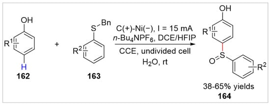 Recently, the Banerjee group [59] further developed an electrochemical sulfinylation of free phenols 162 with sulfides 163 under catalyst- and oxidant-free conditions. The aromatic sulfoxides 164 were obtained with 38–65% yields in an undivided cell equipped with a graphite anode and a nickel cathode at a constant current of 15 mA, using n-Bu4NPF6 as the electrolyte at room temperature (Scheme 27). The phenols bearing the electron-withdrawing groups such as nitro, ester, and aldehyde, were unsuccessfully employed as the reaction substrates under standard conditions. Control experiments suggested that the electrochemical sulfonated reaction was proposed to initiate via the anodic oxidation of phenol to generate carbocation, which was then attacked by the nucleophilic sulfide to generate the desired product.