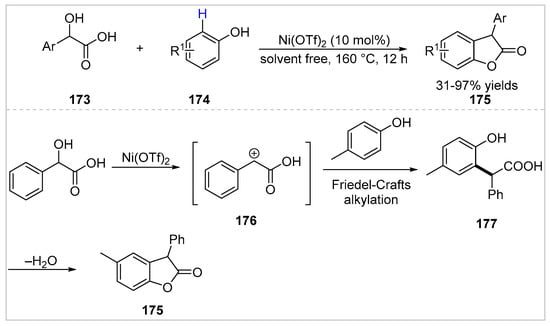 In 2019, Tang et al. [65] developed a recyclable nickel-catalyzed C–H/O–H dual functionalization of mandelic acids 173 with free phenols 174. Various of 3-aryl benzofuran-2((3H)-ones 175 were obtained with 31–97% yields under solvent-free conditions. The authors proposed a possible pathway for dual activation of phenols (Scheme 30). Intermediate 176 was generated from mandelic acid in the presence of Ni(OTf)2. Then, an inter-molecular Friedel-Crafts alkylation of 176 with phenol took place to give intermediate 177, which underwent intramolecular esterification to give the corresponding product 175. This method can be enlarged and applied to synthesize antioxidant Irganox HP-136 in an excellent yield.