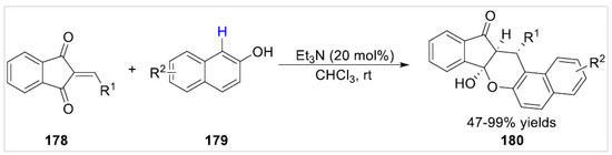 In 2020, Li et al. [66] developed a base promoted diastereoselective [3 + 3] cycloaddition reaction of 2-arylideneindan-1,3-diones 178 with free β-naphthols 179. Various functionalized pentacyclic indeno[1,2-b]chromen-(4bH)-ones 180 were synthesized with 47–99% yields under mild conditions (Scheme 31). Splenocyte cells were treated with the synthesized compounds, and cell viability was determined by CCK-8 assay. These tested compounds showed selective inhibitive activity against ConA-induced T-cell proliferation.