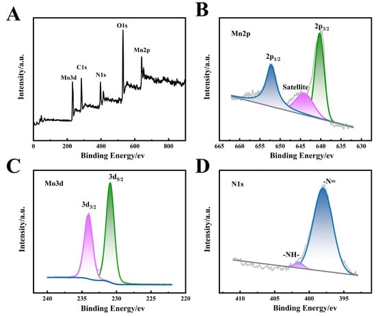XPS full-spectrum analysis of CPOFs (A); Mn 2p region in XPS of CPOFs materials (B); Mo 3d region (C); N 1s region (D).