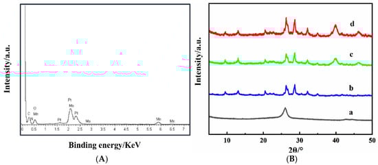 (A) EDS diagram of PtNPs-CPOFs; (B) MWCNTs (a); CPOFs (b); PtNPs-CPOFs (c); XRD pattern of PtNPs-CPOFs-MWCNTs (d).
