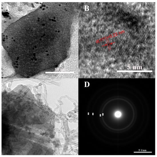 (A) TEM image of PtNPs-CPOFs; (B) HRTEM diagram of PtNPs-CPOFs; (C) TEM images of PtNPs-CPOFs-MWCNTs; (D) Electron diffraction pattern of PtNPs.