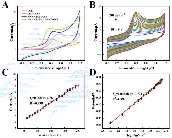(A) CV of bare GCE, CPOFs/GCE, PtNPs-CPOFs/GCE and PtNPs-CPOFs-MWCNTs/GCE in 0.1 M H2SO4 with 0.2 mM thymol (Scan rate: 100 mV s−1); (B) CVs of the PtNPs-CPOFs-MWCNTs/GCE in 0.1 M H2SO4 with 0.2 mM thymol at a different scan rate (from 10 to 200 mV s−1); (C) The linear relationship of anodic peak current values against the scan rates; (D) Plot of the oxidative peak potential versus the logarithm of the scan rate.