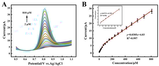 (A) DPV of the PtNPs-CPOFs-MWCNTs/GCE in 0.1 M H2SO4 with different concentrations of thymol from 0.002 mM to 0.810 mM; (B) The calibration curve between response currents and thymol concentration.