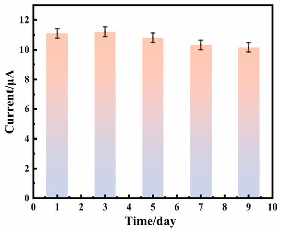 The reproducibility of the fabricated thymol sensor was tested by detecting the responses to 0.2 mM thymol at five electrodes independently. The results showed that the RSD was 3.67%; meanwhile, the modified electrode was applied to the determination of thymol at 0.2 mM five times with an RSD of 2.79%, suggesting that the prepared thymol electrochemical sensor has good reproducibility. At the same time, the prepared sensor was tested every other day. After 9 days, the current response remained at 91.53% of the initial current, indicating that the sensor had acceptable stability (Figure 9).
