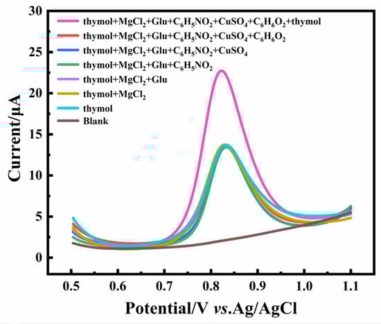 In order to explore whether the designed sensor can be used in real sample testing, the selectivity performance of the sensor was studied, as shown in Figure 10. MgCl2, Glu, P-Nitrophenol (C6H5NO3), CuSO4 and hydroquinone (C6H6O2) were monitored in the detection system. As shown in Figure 10, there was no obvious interference in the detection of thymol. Therefore, the designed sensor can be used to detect thymol with high selectivity.