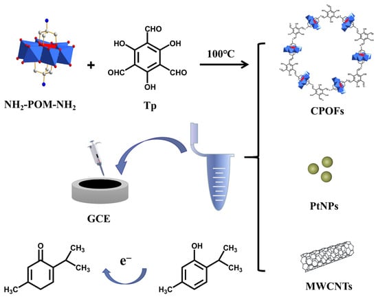 Since Yaghi et al. reported covalent organic frameworks (COFs) in 2005 [] as an emerging class of porous polymers, they have been widely used in catalysis, gas adsorption, energy storage, etc., because of their excellent chemical properties. Hui Zhao used an etched halloysite nanotube as a material on the sensing platform and the COF/MnO2 nanocomposite for signal amplification; an electrochemical biosensor was constructed for detecting human chorionic gonadotropin. This work developed an ultrasensitive assay for the electrochemical detection of human chorionic gonadotropin []. Signal-on electrochemical aptasensors were fabricated for the sensitive and label-free determination of cardiac troponin I by Feng Gao []; the biosensors showed a low detection limit of 2.6 fg mL−1 with a linear range from 10 fg mL−1 to 10 ng mL−1 for cardiac troponin I. However, the preparation of COFs was mainly limited to aromatic organic units until now. In theory, by combining modified POMs with appropriate organic building blocks, covalent polyoxometalate-organic frameworks (CPOFs) can be constructed, and the injection of inorganic components makes CPOFs have richer functional and structural diversity []. Recently, CPOFs constructed from inorganic and organic building blocks were reported and applied to battery and dye degradation, respectively, with good results. Fang et al. reported three-dimensional porous crystalline CPOFs that displayed high reversible capacity []. Yang et al. reported the three isostructural complexes M-Anderson-COFs with a three-interpenetrated diamondoid network. Among them, Mn Anderson-COF exhibited the highest catalytic activity in the photodegradation of RhB and MB in water []. As far as we know, there are no reports on the electrochemical sensing of CPOFs, but it is necessary to develop CPOF-based nanomaterials with high conductivity and excellent catalytic activity for the construction of electrochemical sensors because POMs and COFs both have poor conductivity. It has been reported that functional metal nanoparticles (MNPs) could be loaded onto the surface of COFs to improve the active site []. At the same time, due to the excellent conductivity and stability of carbon nanomaterials, multi-walled carbon nanotubes (MWCNTs) were further introduced to enhance the catalytic activity []. The electrochemical sensor has the advantages of high sensitivity and low detection limit [,]. This inspired us to construct the MNPs-CPOFs nanocomposites with carbon nanomaterials for the detection of thymol.