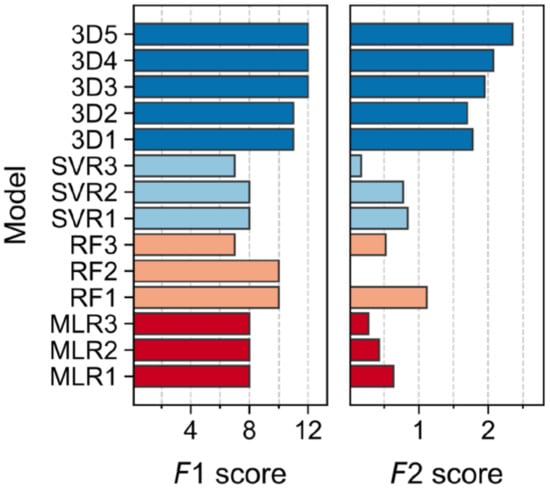 The relative variability among validation metrics was seemingly low as evidenced by the corresponding coefficient of variation, demonstrating that, for most of the statistical parameters, all the models performed rather comparably (Table S5, Supplementary Materials). In addition to directly comparing all the metrics for the validated models, two consensus scores (F1 and F2) were calculated (Figure 2). We have already shown the utility of such a strategy for validation and model performance assessment in regression problems [] (see Table S7, Supplementary Materials, for score definitions). The F1 score denotes the number of statistical parameters within typical or commonly established thresholds (i.e., the number of positive assessments). F2 assigns either a reward or a penalization for each statistical parameter included to reflect compliance with established thresholds in order to assure good performance (the higher F2, the better the model) []. Since it was observed that F1 alone might lead to misinterpretations for models with poor CV statistics, F2 was exclusively calculated for models with and above 0.5, thus guaranteeing more stringent criteria.