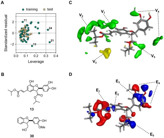 Once having a valid and robust model in hands, determination of the applicability domain (AD) was mandatory in order to fulfill another OECD requirement []. The AD in its currently accepted definition is the response and chemical structure space in which the model makes predictions with a given reliability []. Therefore, it constitutes a fundamental point to assure the correct use of any model when the prediction of new, unseen compounds is desired. Within the plethora of existing methods for defining AD [,], the leverage method [,,,] (a distance-based method) was used in the present research. The corresponding Williams plot (standardized residuals vs. leverage) is shown in Figure 3A. It becomes obvious that none of the compounds in the test set appeared beyond the “warning leverage” (denoted h* and represented by the vertical dashed line), indicating that all of them are within the AD of the model. Leverage values higher than h* in the test set would have indicated unreliable predictions as a result of substantial extrapolation [,]. Notably, compounds 24 and 21 (see Table S1, Supplementary Materials, for structures), members of the training set, have leverages higher than h*, showing their significant influence on the regression model. Both of them were accurately predicted (low standardized residuals). On the other hand, compound 13 (see Figure 3B) yielded a relatively large standardized residual, demonstrating that its activity was not entirely well-predicted by the model, although still located within an accepted range (<2.5σ). Compliance with AD during model building and validation, as demonstrated above for all the compounds used, represents yet another strength of model 3D4. The combination of good validation statistics with proven robustness and well-defined AD, therefore, makes it a reliable model for the prediction of the antileishmanial activity of dihydrobenzofurans. Activity predictions by model 3D4 are summarized in Table S8 (Supplementary Materials).