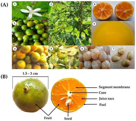 (A) General characteristics of calamondin: (1) flower, (2) stems and leaves, (3) unripe fruits, (4) ripe fruits, (5) peels, (6) peeled fruits, (7) seeds, (8) pulp, and (9) juice. (B) Calamondin fruit structure.