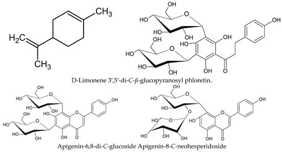 Chemical structures of D-Limonene; 3′,5′-di-C-β-glucopyranosyl phloretin; apigenin-6,8-di-C-glucoside; and apigenin-8-C-neohesperidoside in calamondin fruit peel.