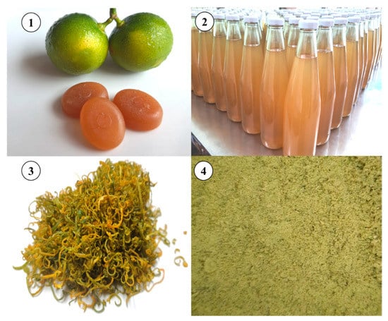 Candy refers to sweet, flavored confections meant to be sucked or chewed. It typically contains sugar as the primary ingredient and may include additional flavorings and ingredients. The physical characteristics of candy can be classified into three types: hard candy, chewy candy, and soft candy [,,]. An example of using calamondin juice to produce hard candy is shown in Figure 4. The process for making calamondin hard candy is as follows: (1) mix glucose syrup and sucrose with calamondin juice as a solvent and simmer, (2) stir until all components are homogenous, (3) increase the temperature to 120–130 °C to raise the sugar concentration, (4) quickly cool the solution down to 70–80 °C, (5) pour the mixture into molds and cool it to room temperature, and (6) package and wrap the candy immediately. A study on the optimal ratio of sucrose to glucose in the development of calamondin fruit candy found that the best ratio was 60% sucrose to 40% glucose. The calamondin fruit candy produced has a bright-yellow color, a citrus aroma and flavor, and a hard texture. Chemical analysis of the candy revealed that it has a moisture content of 1.80%, ash content of 0.15%, reducing sugar content of 68.03%, and total acid content of 2.28% []. The high temperatures in the production process can destroy the natural flavor, vitamin C, and other essential compounds in calamondin []. As a result, synthetic versions of these compounds are added to commercial candy production []. Additionally, low-calorie sweeteners or sugar substitutes, such as sorbitol and mannitol, may replace sugar in sugar-free candy formulas [].