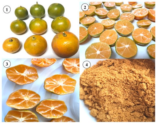 Calamondin powder: (1) grading, (2) cutting and removing seeds, (3) after dehydration, and (4) powder after using a grinder.
