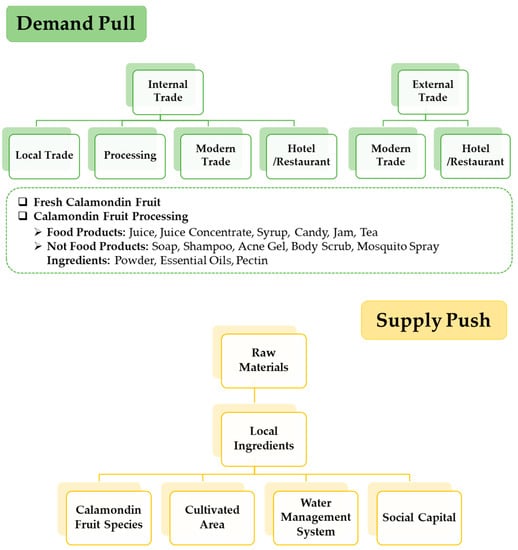 As mentioned earlier, calamondin is a citrus plant native to China and has been widely introduced to various countries in East and Southeast Asia, the Pacific Islands, the USA (Hawaii and Florida), and Central America []. In the past, calamondin was not considered a commercial citrus crop; it was primarily grown as an ornamental plant or a rootstock for citrus grafting [,]. However, it has become a commercial crop in recent years due to its fruits’ pleasant aroma, flavor, and nutritional value [,]. As a result, the global export value of calamondin has increased from USD 111.6 million in 2014 to USD 114.4 million in 2021 []. Calamondin fruit is a versatile and nutritious plant that can meet the needs of health-conscious consumers. It also can create added value as it can be used as an excellent substitute for limes when they are in short supply or expensive. Calamondin fruit has a higher juice yield than lime, with an 80% juice content compared to 40% for lime. In the Thai market, for example, the regular selling price of calamondin is USD 0.6 per kg, but during periods of high lime prices, such as November–January, the price of calamondin may increase to as much as USD 1.8 per kg. The domestic market demands up to 1000 kg of calamondin fruit per day, and it has a high demand in the international market, such as Singapore, which imports the fruit from Malaysia and the Philippines []. Calamondin is a commercially viable crop that is easy to grow, care for, and maintain. It produces fruit all year round and is rarely affected by disease or insect disturbances. This makes it a popular side crop, often planted around rubber trees and other local crops. Due to the increasing demand for fresh and processed products domestically and internationally, cultivation areas for calamondin have been expanding. It is commonly grown in mixed orchards alongside Thailand’s rubber, durian, and mangosteen trees. It is a versatile and nutritious plant that can be grown commercially and is relatively easy to care for. The cost of cultivation is determined by the planting distance, with the lowest price averaging USD 371 per 1600 square meter. Additionally, it has byproducts from providing water, fertilizer, and pest control from the main crop or natural release, making it popular to grow as a side crop with other local crops []. When analyzing the market for calamondin fruit, it is essential to consider both the pull–demand side and the supply–push side (Figure 6). As the demand for fresh and processed products increases at local, provincial, national, and international levels, so does the cultivation of calamondin. This corresponds to the context of Thai society, where fruit is used for both consumption and non-consumer purposes, such as cosmetics. The cultivation of calamondin fruit offers a wide range of benefits, both economically and socially. The growing demand for fresh and processed products, locally and internationally, has increased cultivation areas []. The low cost of cultivation and the ability to grow it as a side crop with other plants makes it an ideal crop for smallholder farmers with low-occupancy areas. Furthermore, the production and processing of calamondin products, such as juice, concentrate, and jam, can create jobs and income for farmers and communities, providing stability and prosperity. The Bio-Circular-Green (BCG) economic model is a model of the economy that emphasizes sustainable growth. Since the start of the privatization of agricultural raw materials cultivation, it has added value by paying close attention to every step of the agricultural raw materials production process and using knowledge, technology, and innovation to achieve the efficiency and effectiveness of the business cycle. The BCG model meets at least five Sustainable Development Goals (SDGs) of the United Nations: sustainable production, consumption, tackling climate change, conservation of diversity, and cooperation for sustainable development [,]. Additionally, the cultivation of calamondin aligns with the bio-circular-green (BCG) economic policy framework, as it utilizes the fruit’s juice, pulp, and peel to add value and reduce agricultural waste. This helps sustain the environment and supports the local economy by creating jobs and income for farmers and communities.
