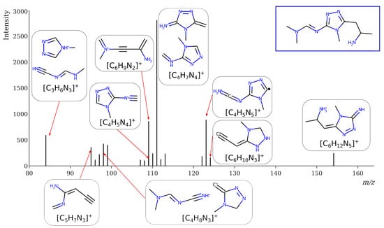However, this criterion still allows for the rejection of false candidates in many cases, e.g., when the observed fragment ion has a molecular formula that cannot be formed from the candidate structure in any reasonable way. In Figure 1, the example of the MS2 spectrum of a newly identified UDMH transformation product is shown. The figure also contains structures of fragment ions proposed by the CFM-ID software. This spectrum is consistent with the proposed structure and with CFM predictions.