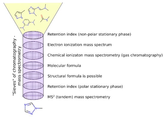 Recently, a more reliable workflow was proposed by our team [17]: the combination of HPLC-HRMS and GC-MS with the methods of artificial intelligence was used to crosscheck the proposed structures of new UDMH transformation products. The proposed structure is considered plausible if it meets several criteria: molecular weight (MW) and exact mass match mass spectrometry (MS) data (using soft ionization methods), the fragmentation in MS with an electron ionization (EI) ion source matches a reference or predicted using machine learning (ML) mass spectrum, and the gas chromatographic retention index (RI) matches the predicted using ML or reference RI. Since reference data are unavailable for the vast majority of candidates, the ML models are key elements of the workflow. However, it is still not possible to be sure of the predicted structures. Additional criteria are required. The GC-MS-based approaches can be used only for volatile UDMH transformation products. However, GC-MS is extensively used for this task (see Table 1).