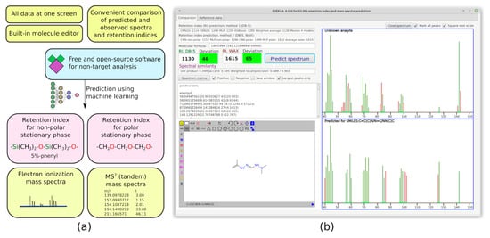 Since the selection of candidates based only on matching factors between the predicted and observed spectra is not a reliable approach, the existing software such as CFM-ID cannot be used alone. There is no alternative software that combines the predicting models for spectra of various types and retention, and that allows for manual comparison in a convenient way. We hope that our software can be used in further research devoted to non-target analysis. The overview of the software and an example screenshot are presented in Figure 3. The Java programming language is used for the development of this software. The software is completely offline, free, and open-source, and it can be downloaded from the GitHub repository: https://github.com/mtshn/svekla (accessed on 1 April 2023).