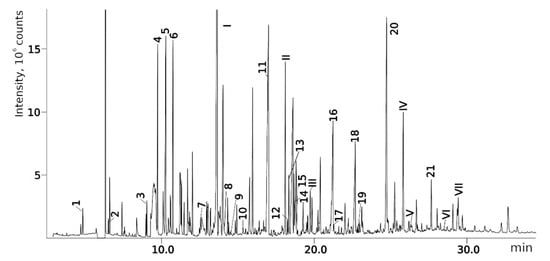 The GC-MS parameters and conditions were similar to those used in the previous work [17]. A Shimadzu GCMS-TQ8040 system (Shimadzu Corporation, Kyoto, Japan) was used to perform GC-MS analysis. GC-MS parameters (polar stationary phase) were used as follows: an injection volume of 1 μL, a sample injection temperature of 250 °C, a split injection mode with a ratio of 1:5, and a carrier gas flow rate of 1.0 mL/min. Temperature program: 3 min at 50 °C, ramping the temperature to 250 °C at a rate of 8 °C/min, then 9 min at 250 °C; ion source temperature 200 °C and scanning range 40–500 m/z. The conditions used for a non-polar stationary phase were the same except for the carrier gas flow rate and temperature program—flow rate: 1.46 mL/min; program: 3 min at 50 °C, then ramping to 320 °C at a rate of 8 °C/min, then 5 min at 320 °C. The NIST 17 (NIST, Gaithersburg, MD, USA) database and the AMDIS software, version 2.3 (NIST, USA) were used for the library search and for deconvolution, respectively. Linear RIs based on n-alkanes were used. More details are provided in the previous work [17].
