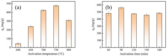 Adsorption capacities of the BACs in relation to (a) activation temperatures and (b) activation times.