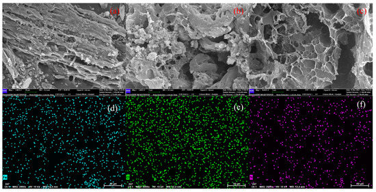 Figure 3a shows that the BAC has a rough surface with some particles. Figure 3b,c confirms that the surface of BAC has a large number of pores with different pore sizes. KOH from the activation process of K2FeO4 corroded the BAC to significantly increase irregular pores [11]. This resulted in BAC having an ultrahigh SSA of 2327.7 cm2/g [28]. Figure 3d indicates that these particles were identified as iron species through EDS analysis. The presence of surface oxygen and nitrogen was related to the oxidation by K2FeO4 and nitrogen compounds in bamboo shoot shells, shown in Figure 3e,f [16]. These groups provided anionic adsorption sites on the surface of the BAC, which improved its affinity for MB [23].
