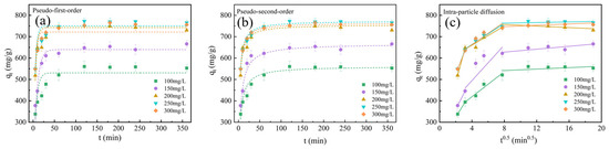 Adsorption kinetics of the BAC were fitted by pseudo-first-order, pseudo-second-order, and intragranular diffusion models (see Figure 9). The models are shown in Equations (17)–(19). As shown in Table 3, the pseudo-second-order model has a higher R2 value of 0.9455, indicating that it was more consistent with the adsorption process of MB [22]. Furthermore, the adsorption capacity of the BAC calculated by the pseudo-second-order model was similar to the experimental adsorption capacity, indicating the existence of chemisorption during the MB adsorption process of the BAC. Chemisorption increased the affinity of the BAC for MB adsorption and reduced its release [29]. Based on the intra-particle diffusion model, the adsorption process of the BAC included three stages. The first stage occurred at 5–10 min. A lot of binding sites of the BAC rapidly transferred MB molecules from the bulk solution [46]. The MB diffused to the inner pore from the surface of the BAC at the second stage at 10–60 min. The adsorption reached equilibrium at the third stage. Figure 9c confirms that all linear extension lines of the internal diffusion model did not pass through the origin at three stages. This indicated that the liquid film or the internal diffusion particles were not the only rate-limiting steps for the BAC [16]. C1 and C2 reflected the liquid film diffusion and intra-particle diffusion, respectively [47]. The higher C2 value indicated that internal diffusion controlled the BAC adsorption rate. The ultrahigh SSA and abundant internal pores of the BAC improved MB to reach interior sites [44]. The higher initial concentration of MB increased the values of both C1 and C2, indicating that the liquid film diffusion and intra-particle diffusion were the main adsorption processes [48].