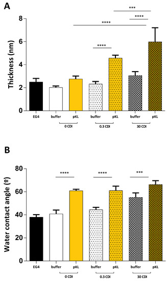 Figure 1A shows the average thickness of the different surfaces determined by ellipsometry. In the absence of pKL, EG4-SAMs displayed a thickness ranging from 2.5 ± 0.3 nm (EG4-SAMs) to 3.5 ± 0.3 nm after CDI activation (30 CDI buffer). Following pKL immobilization, the average thickness ranged from 2.8 ± 0.3 nm when pKL was only adsorbed on EG4-SAMs (0 CDI pKL) to 7.6 ± 1.2 nm when pKL was immobilized on surfaces pre-activated with the higher CDI concentration (30 CDI pKL). These results are in accordance with those obtained in our previous work [24], confirming that pKL was covalently immobilized onto CDI-activated surfaces.