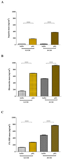 Protein adsorption at the surfaces as quantified by QCM-D. QCM-D results for protein adsorption on pKL-SAMs or in buffer-SAMs. (A) heparin [0.1 mg/mL]; (B) fibronectin [40 μg/mL]; (C) 1% (v/v) FBS solution. Data are expressed as average ± STDEV of three replicates per condition. Statistically significant difference (**** p < 0.0001).