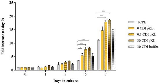 Cells’ metabolic activity was significantly higher in pKL-SAMs (either 0.3 or 30 CDI pKL) than in surfaces where pKL was only adsorbed (0 CDI pKL) and in the controls (30 CDI buffer). Moreover, all the pKL-SAMs had a better hMSC growth-promoting effect than TCPE surfaces. Statistically significant differences were only observed after 5 days in culture (Figure 4).