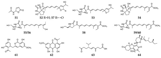 Butenolide (51) was a fusarium mycotoxin from unknown origin strain Fusaium sp. and showed selective inhibitory activity against E. coli [26]. Extensive chemical investigation of the endophytic fungus F. solani JK10 afforded nine 2-pyrrolidone derivatives (52–60), which displayed antibacterial activity against E. coli with MIC values of 5–10 µg/mL. Particularly, three lucilactaene analogs (52–54) had strong inhibitory effects on Acinetobacter sp., comparable to the positive control streptomycin [27]. One new aromatic polyketide, karimunones B (61), together with compounds 62 and 63, was obtained from sponge-associated Fusarium sp. KJMT.FP.4.3 and exhibited anti-multidrug resistant Salmonella enterica ser. Typhi activity with a MIC of 125 µg/mL [28]. Fusapyridon A (64) is produced by an endophytic strain, Fusarium sp. YG-45 demonstrated moderate antibacterial activity against Pseudomonas aeruginosa with a MIC value of 6.25 µg/mL [29].