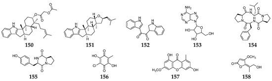 Lateritin (14) derived from Fusarium sp. 2TnP1–2 showed anti-S. aureus activity at 2 µg per disc with 7 mm of inhibition zone [9]. A new polycyclic quinazoline alkaloid (15) displayed moderate antibacterial activity against methicillin-resistant S. aureus and multidrug-resistant S. aureus, with the same MIC value of 6.25 µg/mL [10]. Three pyranopyranones (16–18) showed weak inhibitory activities against S. aureus, methicillin-resistant S. aureus, and multidrug-resistant S. aureus [11]. Compound 19 was a new pyran-2-one with weak activity against methicillin-resistant S. aureus and was shown to be the inhibitor of the quorum-sensing mechanism of S. aureus and Pseudomonas aeruginosa [12]. Trans-dihydrofusarubin (20) and seven analogs (21–27) had significant antibiotic activity against S. aureus (MIC values < 4 µg/mL), and compounds 26 and 27 exhibited potent activity against S. pyogenes [13]. Five naphthoquinones 28–32 showed anti-Mycobacterium tuberculosis activity with MICs ranging from 25 to 50 µg/mL [14]. Compounds 32 and 33 displayed moderate antibacterial activity against S. aureus and potent activities against B. cereus and S. pyogenes with MIC values of <1 µg/mL as compared to ciprofloxacin, whose MIC value was 0.15 and 10 µg/mL, respectively [15].