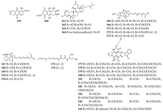 Parasitic diseases caused by protozoa, helminths and ectoparasites affect millions of people each year and result in substantial morbidity and mortality, particularly in tropical regions [95]. Therefore, new antiparasitic agents are urgently needed to treat and control these diseases. A total of 39 antiparasitic SMs (23, 28, 29, 59, 108, 93, 116, 133–137, 159–185, Figure 7) had been isolated and characterized from Fusarium strains. Five naphthoquinones (23, 29, 30, 109, and 159) and one anthraquinone (160) showed weak inhibitory activity toward the most deadly malaria parasite Plasmodium falciparum K1 with IC50 values in the range 9.8–26.1 µM [96]. However, compound 93 displayed significant antiplasmodial activity toward P. falciparum (D6 clone) with an IC50 value of 0.34 µM [49]. Bikaverin (116) was specifically effective against Leishmania brasiliensis, which is one of the main causes of cutaneous leishmaniasis in the Americas [97]. Beauvericin (133) was reported to inhibit Trypanosoma cruzi with an IC50 value of 2.43 μM and L. braziliensis with an EC50 value of 1.86 μM [98,99]. In addition to antibacterial and antifungal effects, enniatins (134–137) exhibited mild anti-leishmanial activity by inhibition of the activity of thioredoxin reductase enzyme of P. falciparum [6]. Integracides F, G, H, and J (161–164) were also shown to have stronger anti-leishmanial activity towards L. donovani than the positive control pentamidine (IC50 = 6.35 µM) [100]. Among twelve lucilactaene derivatives (165–176), compounds 166–168 showed very potent antimalarial activity toward P. falciparum (IC50 = 0.0015, 0.15, and 0.68 μM, respectively) [101,102,103]. Structure−activity relationship study suggested that epoxide is extremely detrimental, and demethylation of the lucilactaene methyl ester and formation of the free carboxylic acid group resulted in a 300-fold decrease in activity. Nine cyclic tetrapeptides (177–185) are apicomplexan histone deacetylase (HDA) inhibitors [104,105,106]. Particularly, compound 177 was an excellent inhibitory agent (IC50 < 2 nM) and showed in vivo high efficacy against P. berghei malaria in mice at less than 10 mg/kg.