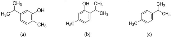 Main components of Origanum EOs. (a) Carvacrol; (b) Thymol; (c) p-Cymene.