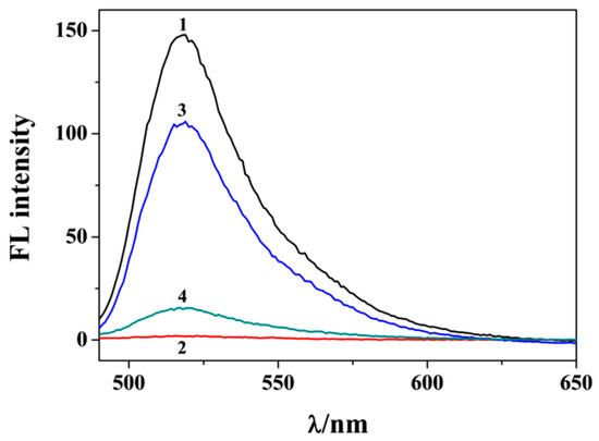 Fluorescence spectra of different systems: FITC-GDEVDGH6 (curve 1), FITC-GDEVDGH6 + Ni-NTA-MNP (curve 2) and FITC-GDEVDGH6/Cas3 + Ni-NTA-MNP (curve 3). Curve 4 corresponds to that of incubation of FITC-GDEVDGH6/Ni-NTA-MNP with Cas3. The concentrations of FITC-GDEVDGH6 and Cas3 used were 500 nM and 100 ng/mL.