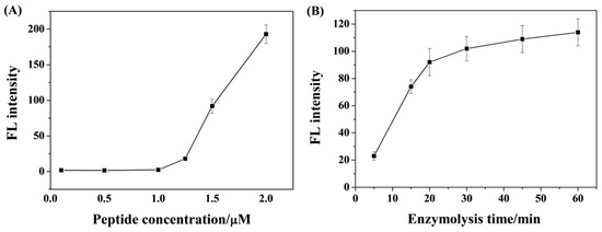 Dependence of fluorescence intensity on peptide concentration (A) and enzymolysis time (B).