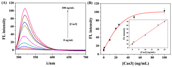 (A) Fluorescence spectra for the assays of various concentrations of Cas3 (from bottom to top: 0, 0.01, 0.1, 1, 10, 20, 25, 50 and 100 ng/mL). (B) Calibration curve between fluorescence intensity and Cas concentration.