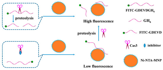 Nanomaterials such as gold nanoparticles, carbon nanotubes and graphene oxide as quenchers have been integrated with single-labeled fluorescent peptides for monitoring protease activity through the fluorescence resonance energy transfer (FRET) effect [32,33,34,35,36,37]. The nanomaterials usually exhibit superior quenching ability to molecular quenchers due to the long-range energy transfer. However, immobilization of peptide substrates on the solid surface may cause the steric hindrance effect to affect the configurational freedom of peptides, thus limiting their interaction with proteases and decreasing the cleavage efficiency [38,39]. In addition, peptide immobilization requires laborious and time-consuming procedures. In this respect, it is of paramount importance to the manipulation of external surfaces for anchoring peptide substrates. Oligohistidine-tag (His-tag) can be easily integrated into peptides or proteins through synthetic or recombinant techniques. The nickel ion-nitrilotriacetic acid (Ni-NTA) complex shows high-affinity toward His-tag in which four coordination sites are occupied by NTA and two of them are coordinated with two imidazole moieties of His-tag [40,41,42]. Based on strong and specific interactions, Ni-NTA-conjugated polymers, magnetic beads and silica nanoparticles have been widely applied for the separation, purification and delivery of peptides and proteins with His-tags [41,43,44,45,46]. In this work, the commercialized Ni-NTA-conjugated magnetic nanoparticles (MNPs) were employed for the development of a switch-on fluorescent biosensor for monitoring protease activity with Caspase-3 (Cas3) as an example. Fluorescently-labeled peptide substrates with His-tags can be captured by Ni-NTA-MNPs through the interactions between His-tag and Ni-NTA, leading to adecrease in fluorescence. When peptide substrates were degraded using the proteolysis, the fluorophore-included peptide segments were released from the peptide substrates or the peptide-conjugated NTA-Ni-MNPs, thus turning on the fluorescence of solution. The reaction rate of proteolysis for the peptides dispersed in solution and immobilized on the surface of NTA-Ni-MNPs was investigated. This strategy can be used for the detection of various proteases by matching the peptide sequences specific to the targets. In addition, by replacing the fluorophores with other signal molecules such as electroactive molecules, enzymes and nanoparticles, single-labeled peptides could be used for electrochemical or colorimetric analysis of the activity of various proteases.