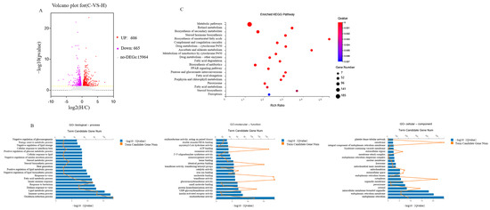 An analysis of DEG distribution ((A). volcano plot) between the control group and the CFEAt group. All gene expression levels are expressed as a log2 fold for CFEA group/Control group. (B). GO enrichment analysis (“Cellular component”, Molecular function” and “Biological process”). (C). KEGG assignment of unigenes in the Liver transcriptome of mice.
