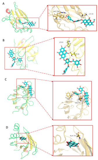 The molecular docking of four symbolic compounds with FABP protein. 3′-O-methyl-4-O-(n″-O-galloyl-β-d-xylopyranosyl) ellagic acid(n = 2, 3 or 4) (A), 4-O-(3″,4″-O-digalloyl-α-l-rhamnosyl)ellagic acid (B), terflavin B (C) and chebulic acid (D) with FABP protein. The figure on the left shows that the compounds is located in the binding pocket of FABP protein. The figure on the right shows the binding sites of compounds and FABP protein.