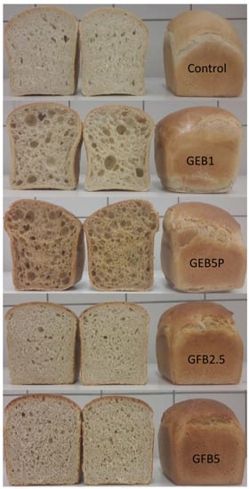The change in crumb firmness was measured only in three bread samples (control, GFB5, GFB2.5); measurements of other samples could not be obtained because the crumbs were too sticky. The supplement of 5% wheat flour with “germinated + fermented” spelt resulted in a 111% increase in firmness, while flour replacement of 2.5% had no statistically significant impact on it. The wet sticky crumbs of other bread samples can be explained by the excessive hydrolysis of starch, proteins and arabinoxylan, resulting in the release of an excess of water previously bound to these polymers. The increase in enzyme activity was not only a consequence of the presence of microorganisms or the addition of exogenous enzymes but was also caused by the activation of endogenous enzymes during the germination of spelt seeds. Excessive darkening of the bread crust and stickiness of the dough were associated with increased activity of α-amylases and xylanases. It is known that the profound degradation of arabinoxylan by exogenous xylanases and the release of water previously bound to arabinoxylan can lead to very poor dough manageability []. Furthermore, the elevated protease activity in bioprocessed flour can result in the additional release of water due to the degradation of proteins during dough processing. Other studies have also reported a negative impact of a higher addition (more than 10%) of bioprocessed flour on the quality parameters of bread [,,]. Bioprocessed flours in proper quantities can be used as an alternative to conventional flour improvers such as enzymes and malt.