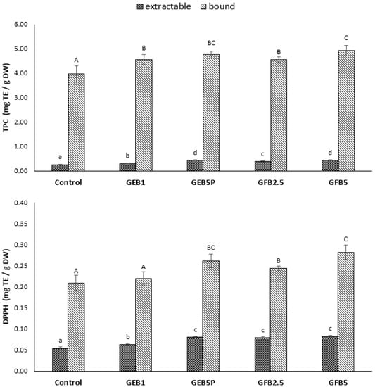 Total phenolic content (TPC) and DPPH• scavenging activity (DPPH) for the extractable and bound fractions of control and bioprocessed breads. Data are means ± SD. Different small letters indicate statistically significant differences between the extractable phenolics (p < 0.05; Duncan’s multiple range tests). Different capital letters indicated statistically significant differences between the bound phenolics (p < 0.05; Duncan’s multiple range tests). Control: white wheat bread; GEB1: wheat bread supplemented with 1% “germinated + enzymatic treated” spelt flour; GEB5P: wheat bread supplemented with 5% pasteurised (30 min, 85 °C) “germinated + enzymatic treated” spelt flour; GFB2.5: wheat bread supplemented with 2.5% “germinated + fermented” spelt flour; GFB5: wheat bread supplemented with 5% “germinated + fermented” spelt flour; mg TE/g DW: mg Trolox equivalents per g dry weight.