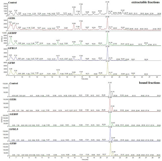 HPLC-MS chromatograms of the extractable and bound fractions of the control and bioprocessed breads (detected at 310 nm). Control: white wheat bread; GEB1: wheat bread supplemented with 1% “germinated + enzymatic treated” spelt flour; GEB5P: wheat bread supplemented with 5% pasteurised (30 min, 85 °C) “germinated + enzymatic treated” spelt flour; GFB2.5: wheat bread supplemented with 2.5% “germinated + fermented” spelt flour; GFB5: wheat bread supplemented with 5% “germinated + fermented” spelt flour.