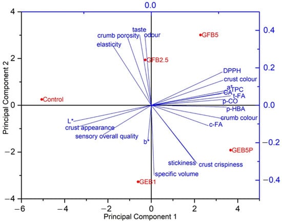 Plot of the variables and bread samples on the first and second principal component axes. Control: white wheat bread; GEB1: wheat bread supplemented with 1% “germinated + enzymatic treated” spelt flour; GEB5P: wheat bread supplemented with 5% pasteurised (30 min, 85 °C) “germinated + enzymatic treated” spelt flour; GFB2.5: wheat bread supplemented with 2.5% “germinated + fermented” spelt flour; GFB5: wheat bread supplemented with 5% “germinated + fermented” spelt flour; L*: lightness; a*: redness; b*: yellowness; t-FA: trans-ferulic acid; c-FA: cis-ferulic acid; p-CO: p-coumaric acid; CA: caffeic acid; p-HBA: p-hydroxybenzoic acid; TPC: total phenolic content; DPPH: DPPH• radical scavenging activity.